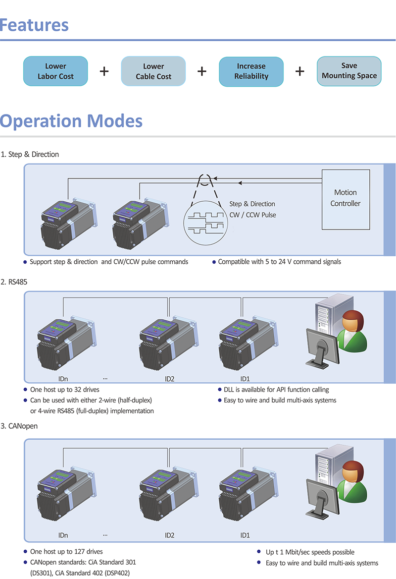 特性 * 高性能直流无刷电机+驱动一体化; * 节省接线人工,提高设备组建效率; * 节省安装空间,是高集成度设备首选; * 减少干扰,提高可靠性; * 脉冲和方向控制,信号电平5 - 24V兼容; * 两个安装风格,分别兼容步进电机和伺服电机机座; * 具有过压、过流保护和报警输出功能;